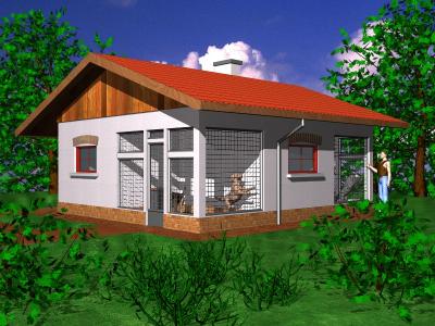 Jest to budynek inwentarski przeznaczony do hodowli psów rasowych. Znajdują się w nim 2 osobne kojce dla psów z małym wybiegiem przykrytym dachem oraz dodatkowe pomieszczenie przeznaczone do pielęgnacji lub w miarę konieczności jako izolatka porodowa. Realizacja w systemie tradycyjnym.