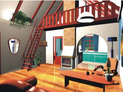 Budynek całoroczny z bloczków THERMOREX, strop drewniany, więźba drewniana, pokrycie dachówką ceramiczną . Na powierzchni 43,1 m2 znajdują się: pokój z kominkiem, połączona z pokojem dziennym kuchnia, sypialnia i łazienka. po drewnianych schodkach drabiniastych wchodzi się na antresolę, gdzie można urządzić dodatkowe miejsca do spania. Ogrzewanie elektryczne i centralnie ustawiony kominek ogrzeje doskonale całość. Kąt nachylenia połaci 45 stopni. Wysokość w kalenicy 6,27m. W posiadaniu lustrzane odbicie.