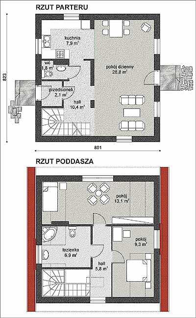 Budynek jednorodzinny, parterowy, z poddaszem mieszkalnym, niepodpiwniczony. Minimalna szerokość działki: 16.40. Ściany zewnętrzne: grubość 38 cm: pustak MAX, cegła kratówka i styropian. Strop: drewniany. Schody: drewniane. Dach: dwuspadowy o nachyleniu 49 stopni, więźba jętkowa drewniana, krycie dachówką ceramiczną