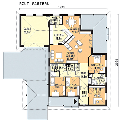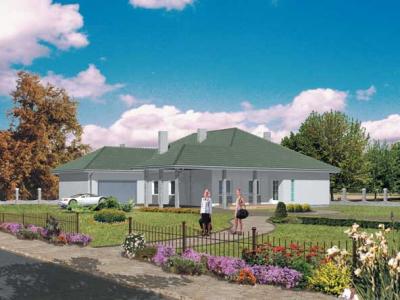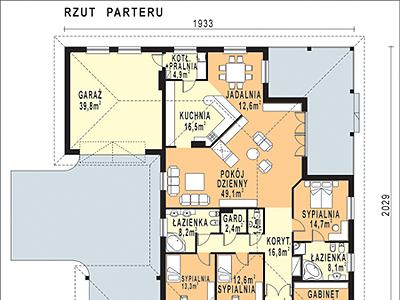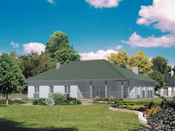 Budynek jednorodzinny, parterowy z poddaszem nieużytkowym, niepodpiwniczony. Minimalna szerokość działki: 27.80. Ściany zewnętrzne: gr. 36 cm z bloczków SILKA 24 cm + wełna min.. Strop: drewniany. Dach: wielospadowy o nachyleniu 30 stopni, więźba z wiązarów drewnianych, krycie dachówką bitumiczną. Poziom kalenicy: 7,83 m od terenu