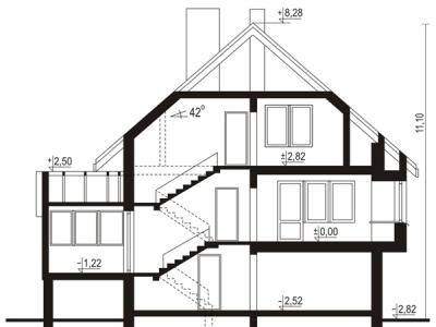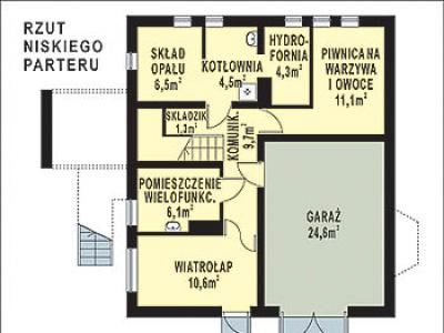 Budynek jednorodzinny z niskim i wysokim parterem z poddaszem mieszkalnym, niepodpiwniczony. Minimalna szerokość działki: 21,34. Ściany zewnętrzne: gr. 38 cm z pustaków ceramicznych MAX 19 cm + styropian 7 cm + cegła kratówka 12 cm. Strop: FERT. Schody: żelbetowe. Dach: dwuspadowy, o nachyleniu 42 stopni, więźba krokwiowo-jętkowa, krycie dachówką lub blachą głębokotłoczoną. Poziom kalenicy: 11,10 m od terenu
