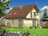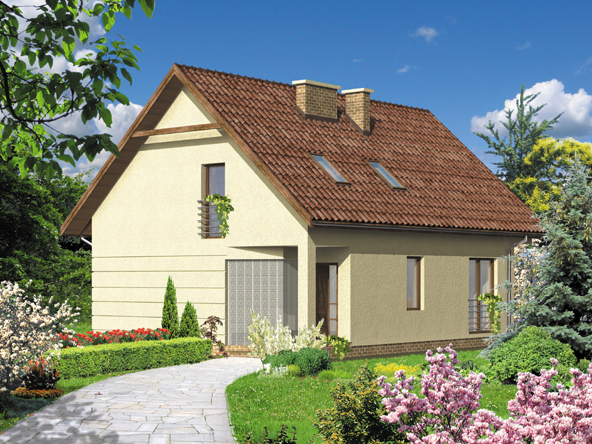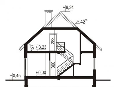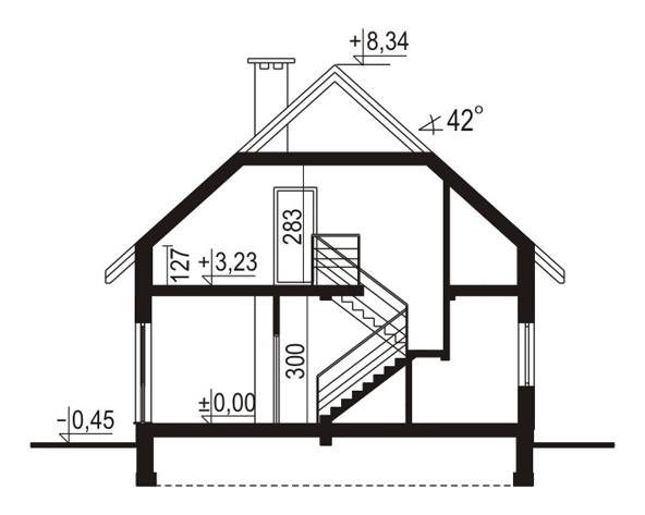 Budynek jednorodzinny parterowy z poddaszem mieszkalnym i sklepem, niepodpiwniczony. Minimalna szerokość działki: 17,30. Ściany zewnętrzne: gr. 36,5 cm z bloczków YTONG. Strop: żelbetowy. Dach: dwuspadowy o nachyleniu 42 stopni, kryty dachówką. Poziom kalenicy: 8,79 m od terenu. Dodatkowe informacje: zobacz także projekty WB-0025, WB-0027, WB-0074 i WB-0016