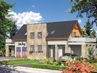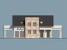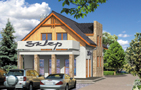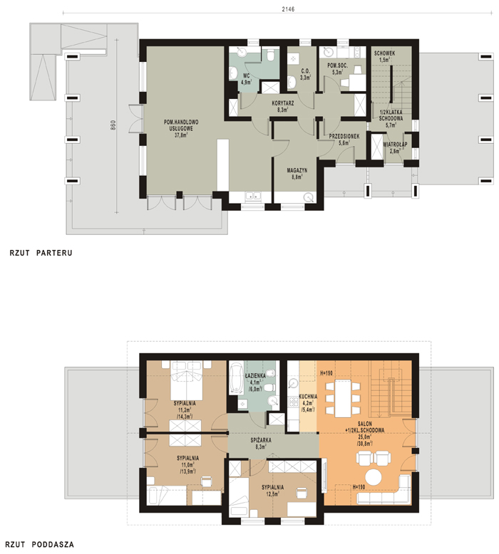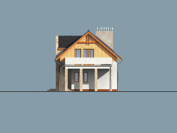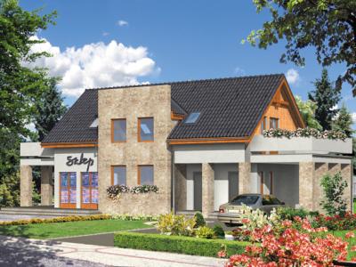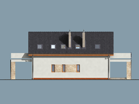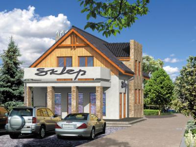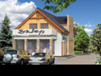 Budynek jednorodzinny parterowy z poddaszem mieszkalnym i sklepem, niepodpiwniczony.. Minimalna szerokość działki: 16,88. Ściany zewnętrzne: gr. 36,5 cm z bloczków YTONG. Strop: żelbetowy. Dach: dwuspadowy o nachyleniu 40 stopni, kryty blachą dachówkopodobną. Poziom kalenicy: 8,46 m od terenu. Dodatkowe informacje: zobacz także projekty WB-0025, WB-0027, WB-0074, WB-0076 i WB-0016