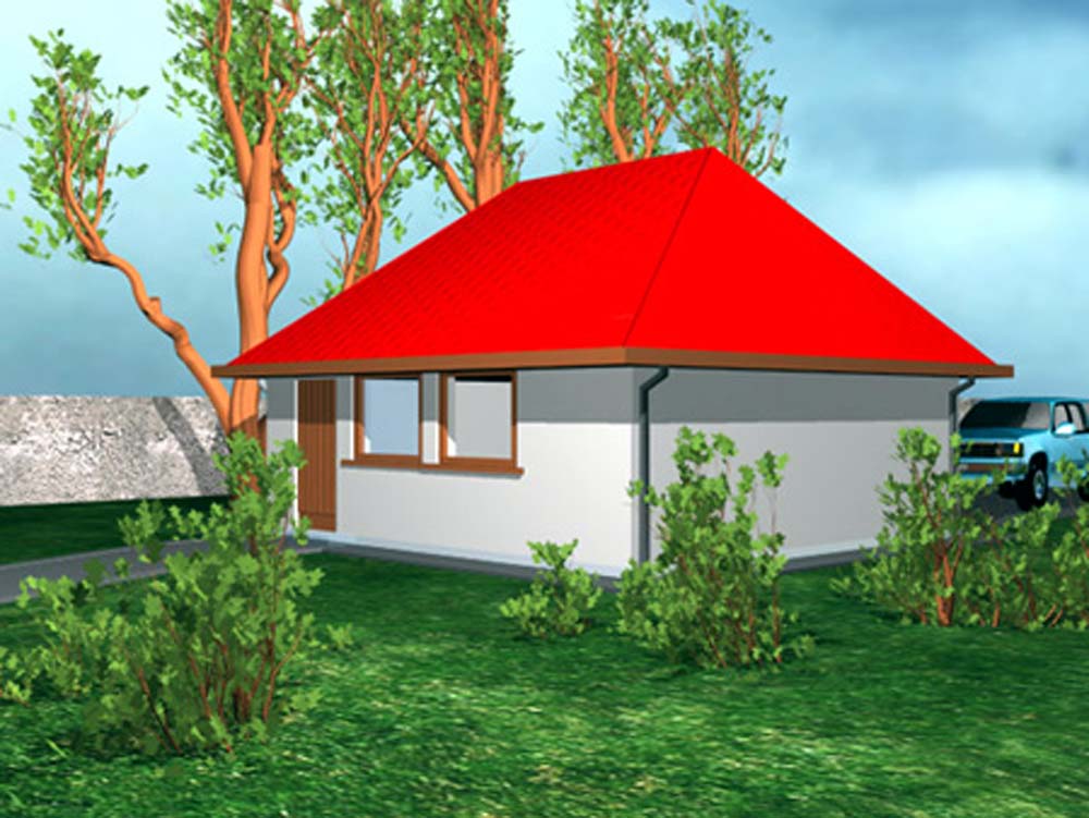 Fundamenty betonowe, ściany zewnętrzne z pustaków MAX 29cm, więźba drewniana, pokrycie dachówką ceramiczną lub blachą dachówkową. Kalenica równolegle do wjazdu.